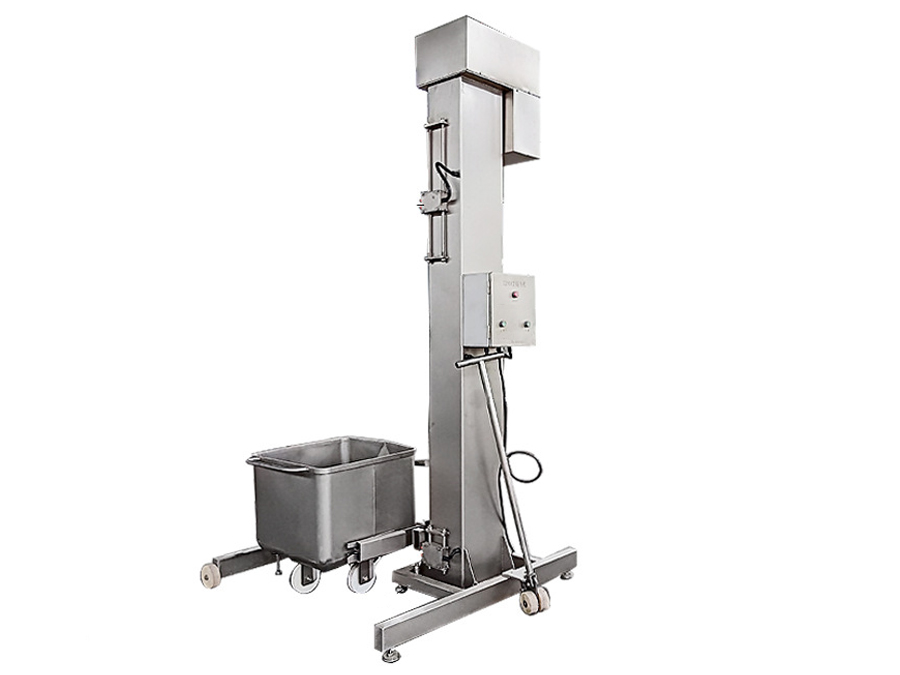 立式提升机是专为200L标准肉车配套的提升设备,其功能是将物料提升到一定高度后,倾倒至设备的料斗中,以完成加料工作。